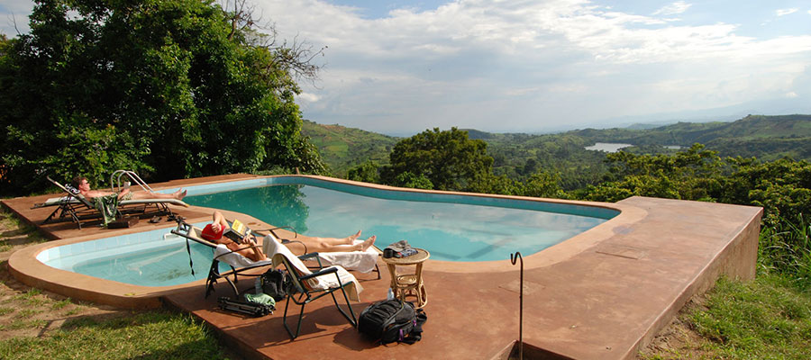 Primate Lodge Kibale welcomes you to experience the amazing wonders of the African jungle, the greatest variety and concentration of primate species found anywhere in Africa as well as excellent food and the warmest service and hospitality from trained, friendly staff – you are assured an all rounded memorable accommodation experience. Each spacious cottage comes with a choice of twin or double beds made up with the softest bed linen and feather pillows. An indoor seating area leads out to a private deck where you can enjoy morning tea or coffee with views over the lake and the Rwenzori Mountains. The en-suite bathrooms boast marble counter-top basins set atop crafted Elgon olive pedestals, claw footed freestanding baths, and glass-walled showers. With modern solar power, you will always have hot water and electrical charging points. The lodge has a swimming pool overlooking the lake, which provides the perfect space for you to relax and unwind. Here you can soak up the peace and tranquility of Lake Kyaninga and the mountains beyond. The Lounge & Dining provide a relaxing atmosphere to relax by the fire with a drink from the fully stocked bar after a yummy dinner.