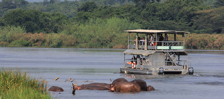 The grassland plains supports a variety of wildlife safari animals which can be viewed from a vehicle on the network of tracks designated in the park. About 20 predators are found in the park such as lions, leopards, side stripped jackal and spotted hyena among others.Common Antelopes species include the kob, bush buck, topi and water buck. Other animals which can even be found at Mweya peninsular are buffaloes, elephants, warthogs and hippos. There are also various primate species available in the park including chimpanzees, red-tailed monkeys, blue monkey, black and white colobus monkey, olive baboons among others. The Ishasha sector is famously known for its tree climbing lions and it is also known to host the world’s highest concentration of hippos.