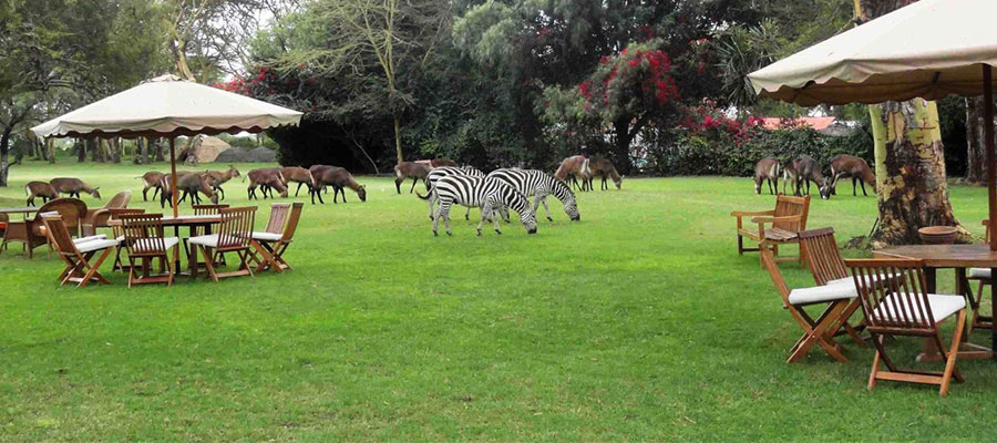 Set in one hundred and fifty acres of grassland studded with Acacia bushes and trees, the resort is not only home to our resident giraffe, waterbuck and both Vervet and Colobus monkeys, but it is also a night stop for the hippos when they leave the lake every night to come and trim the grass on our expansive lawns. The cottages are divided into upstairs rooms which each have a single king size bed and the downstairs ones with two queen size beds, All rooms are spacious, elegantly decorated with views of the well-maintained lawns as well as lavishly appointed bathrooms. Each room in Sopa Lodge Naivasha is fully air conditioned and features a flat screen TV with satellite channels, a hairdryer, a living area and a work desk. Guests may dine indoors at the buffet area where a variety of Continental, Swahili and Mediterranean cuisines are offered. The lodge has an ultra-modern gym, a children's pool and an adult pool flanked by sun beds. Guests can also enjoy boat rides and a relaxing day at the spa. Naivasha Sopa Lodge also has state of art meeting and conferencing facilities for corporate events to cater up to 120 delegates with the expansive gardens ideal for wedding receptions.