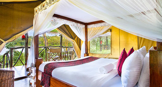 Guest tents are situated amidst landscaped campgrounds with views of the surrounding flora, trees and valley, and the quietest most private tents are located away from the main central areas. The restaurant seats approximately 80 people comfortably and serves a buffet breakfast and lunch. Dinner is a mix of table d’hôte or buffet style. At night, your tent and common areas are lowly lit so at to blend in with the bush and avoid the urbanization of Flamingo Hill.