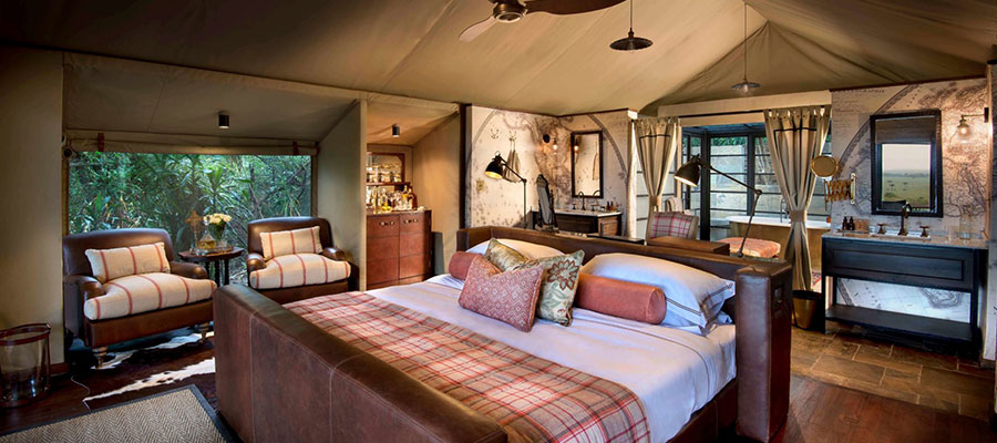 Sentinel Mara Camp is an owner run luxury seasonal camp along the banks of the Mara River within the Masai Mara National Reserve. It is well hidden within the riverine forest so that you don’t know that you are approaching until you are actually in this gorgeous little camp. The feel is deliciously old fashioned with only 7 en suite tents together with the lounge and dining tents along the river in the forest offering excellent privacy. Specially designed campaign furniture adorns the camp creating the atmosphere of the traditional East African safari while at the same time affording a significant measure of luxury to guests